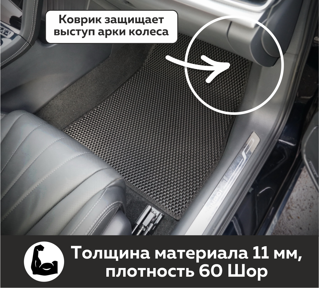 Толщина ковриков EVA составляет 10-12 мм. Глубина ячеек 7-8 мм. Такая толщина ковриков позволяет им служить довольно долго, не протираясь до 3 лет. А благодаря такой глубине ячеек коврик EVA площадью 1 кв.м. способен захватить около 3,5 л жидкости, сохраняя в чистоте вашу обувь и обивку салона.