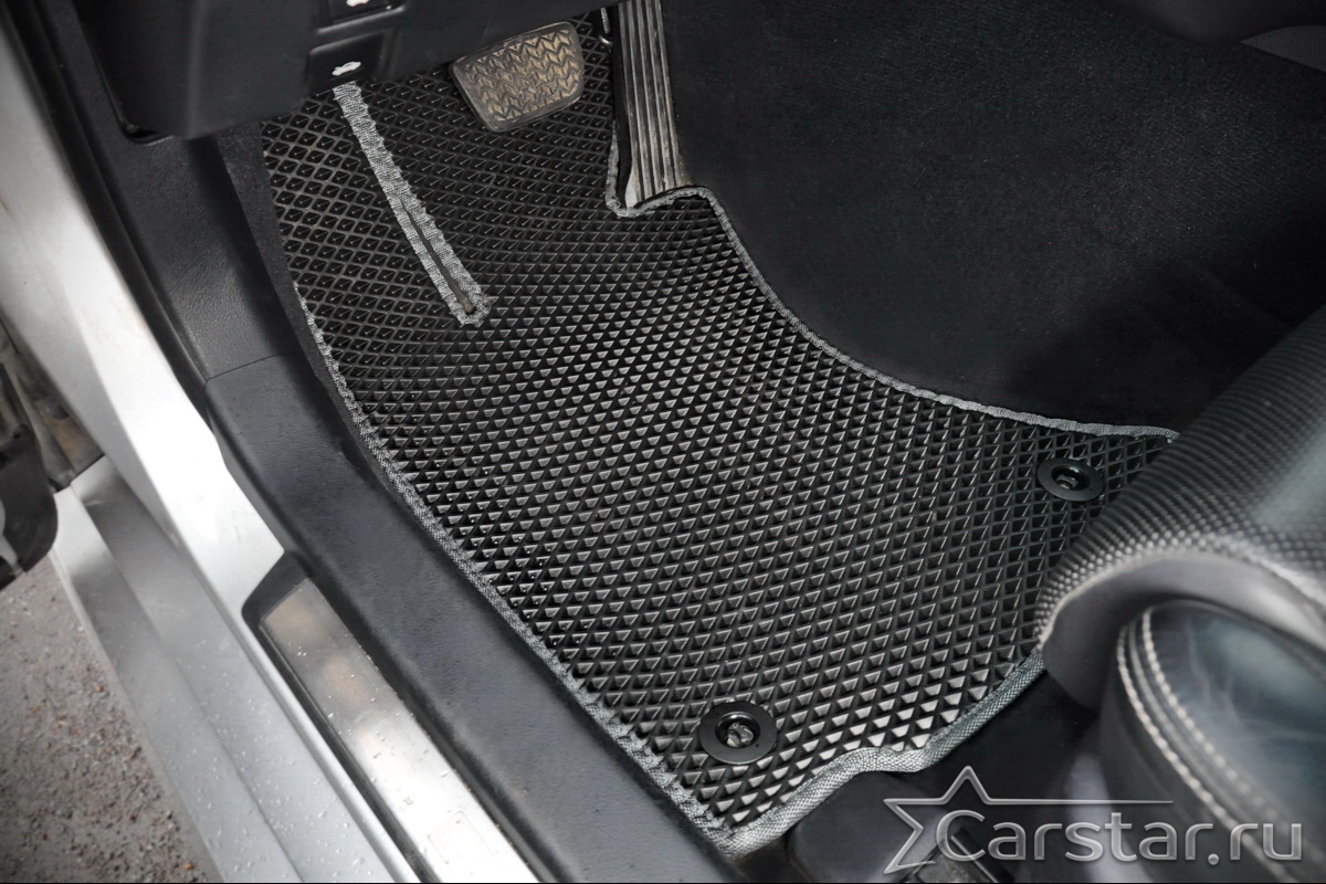 Текстильные коврики надёжно крепятся с помощью оригинальных систем фиксации. Обратная сторона имеет противоскользящее покрытие, что обеспечивает защиту от смещений и безопасность. Максимальное удобство достигается точными лекалами.